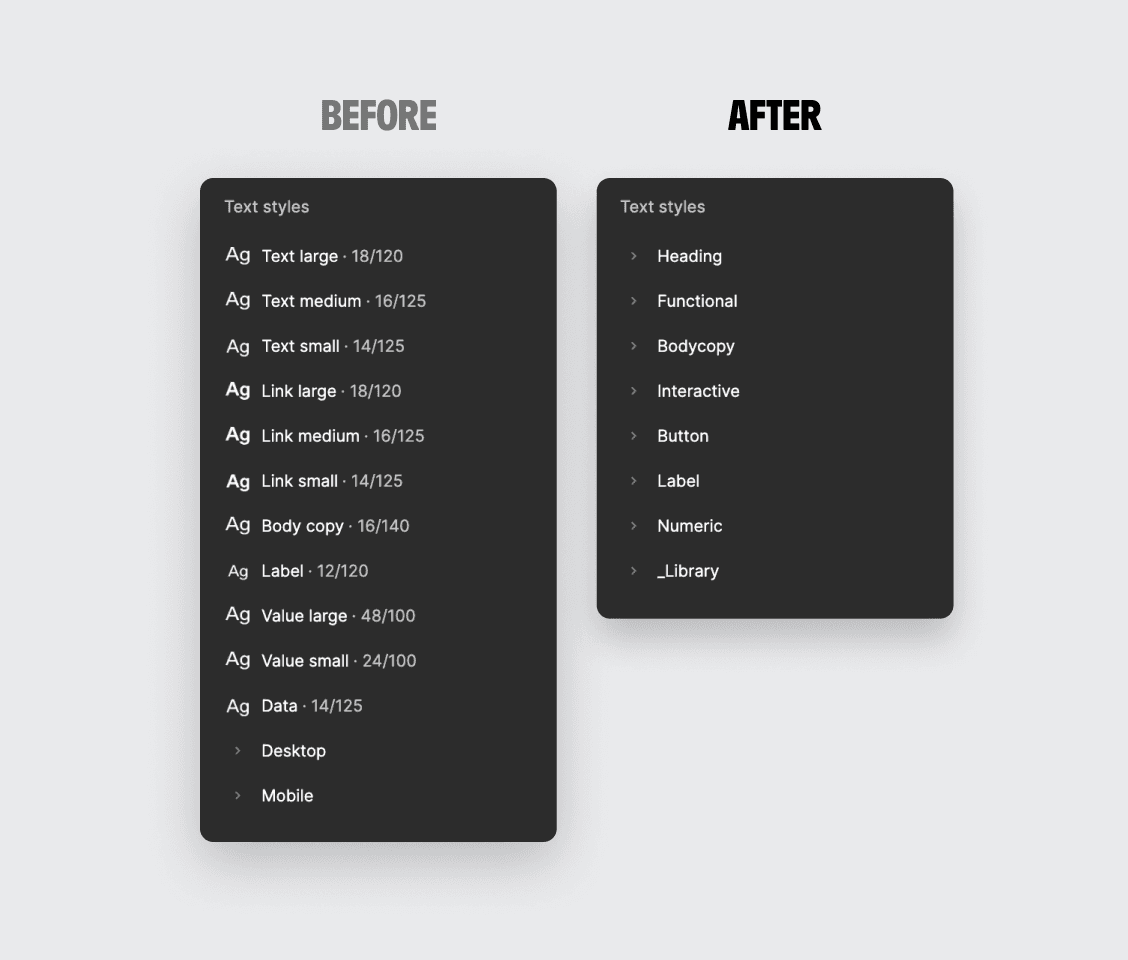 Reorganizing text styles into clear categories, making it easier for designers to locate and apply them consistently;