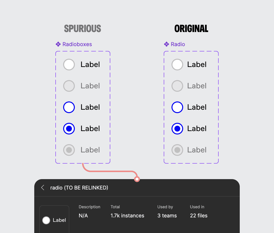 Duplicated Components: numerous master components were duplicated, creating thousands of spurious instances across MIO files due to inconsistent linking. This led to confusion for other product designers, as searching for a component would surface multiple options for the same element;